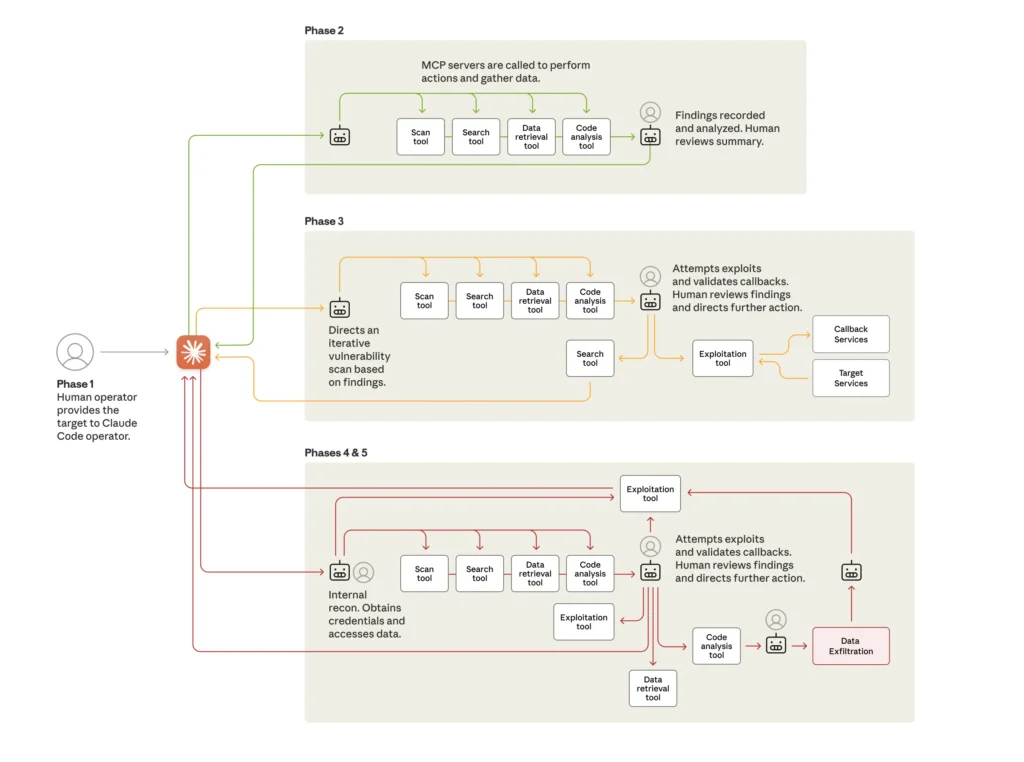 Anthropic’s investigation describes a campaign, designated GTG-1002, in which a Chinese state-sponsored group used Claude Code to carry out specific tasks inside a broader intrusion framework. The humans selected the targets, supplied the initial instructions, established the personas used to bypass safeguards, and approved each escalation point. Claude Code then executed the assigned technical steps through MCP servers and common penetration testing tools.