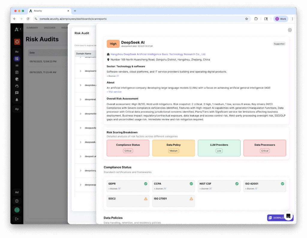 Once all data is gathered and verified, Acuvity’s proprietary risk engine analyzes the information to determine potential risks associated with each domain. The engine considers multiple factors across compliance status, data policies, service tier capabilities, and data processor arrangements to generate a comprehensive risk score.