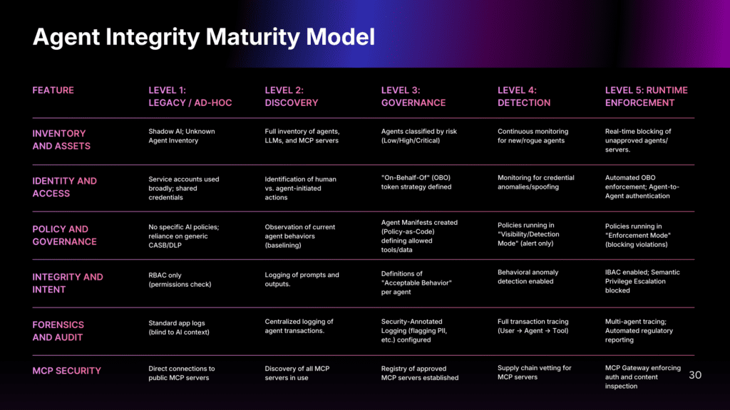 The six capability areas (Inventory and Assets, Identity and Access, Policy and Governance, Integrity and Intent, Forensics and Audit, and MCP Security) mature together, not independently. An organization with perfect MCP security but no discovery or identity attribution doesn’t have mature security in one area; they have a false sense of security. The goal is not to reach Level 5 in every area immediately, but to understand your current state and build capabilities systematically based on your risk profile and regulatory requirements.