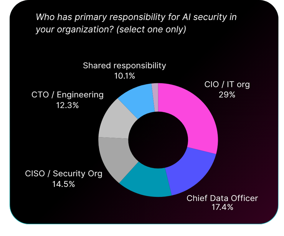 When we asked who owns AI security, CIOs came first at 29%. CISOs, who own every other security domain in the enterprise, ranked fourth at just 14.5%, behind Chief Data Officers (17%) and infrastructure teams (15%).