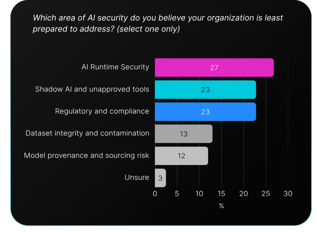 The 27% who say they’re least prepared for runtime security are being honest about a gap most organizations face. They lack visibility into AI behavior in production. They can’t detect when models drift or when outputs become unreliable. They struggle to identify prompt manipulation or adversarial inputs in real-time.