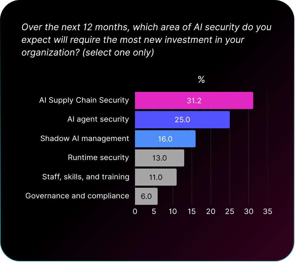 Thirty-one percent of organizations are making AI supply chain security their top investment priority over the next twelve months. This represents one of the biggest shifts in enterprise security spending in decades, signaling a move beyond isolated tool management toward comprehensive supply chain oversight that encompasses models, datasets, agents, plugins, APIs, and SaaS AI features.